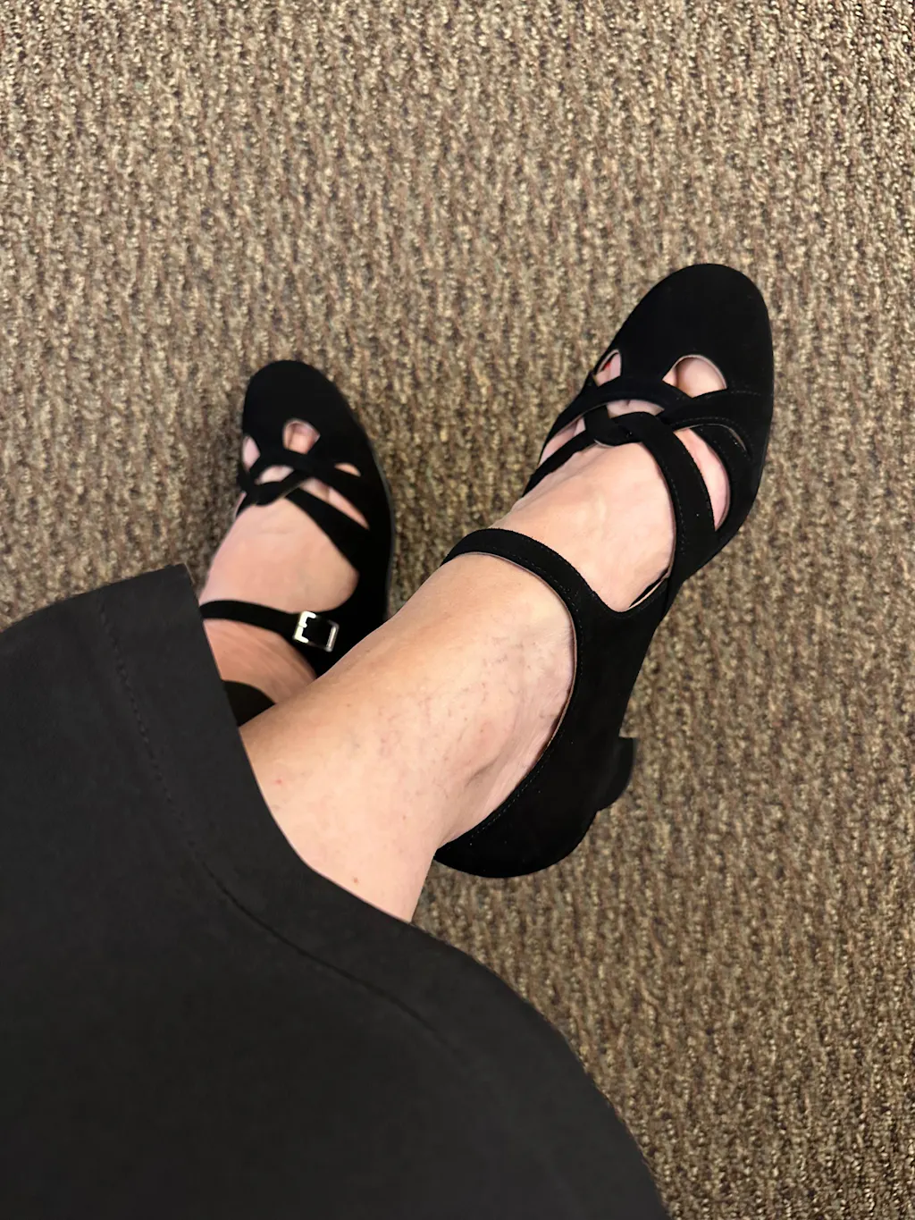 Cute and feminine everyday suede shoes with a braided pattern and ankle strap.